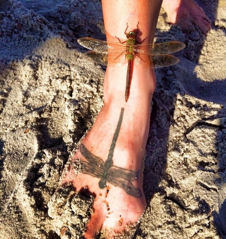 11: "A dragonfly landed on my friend's foot and mirrored its own tattoo."